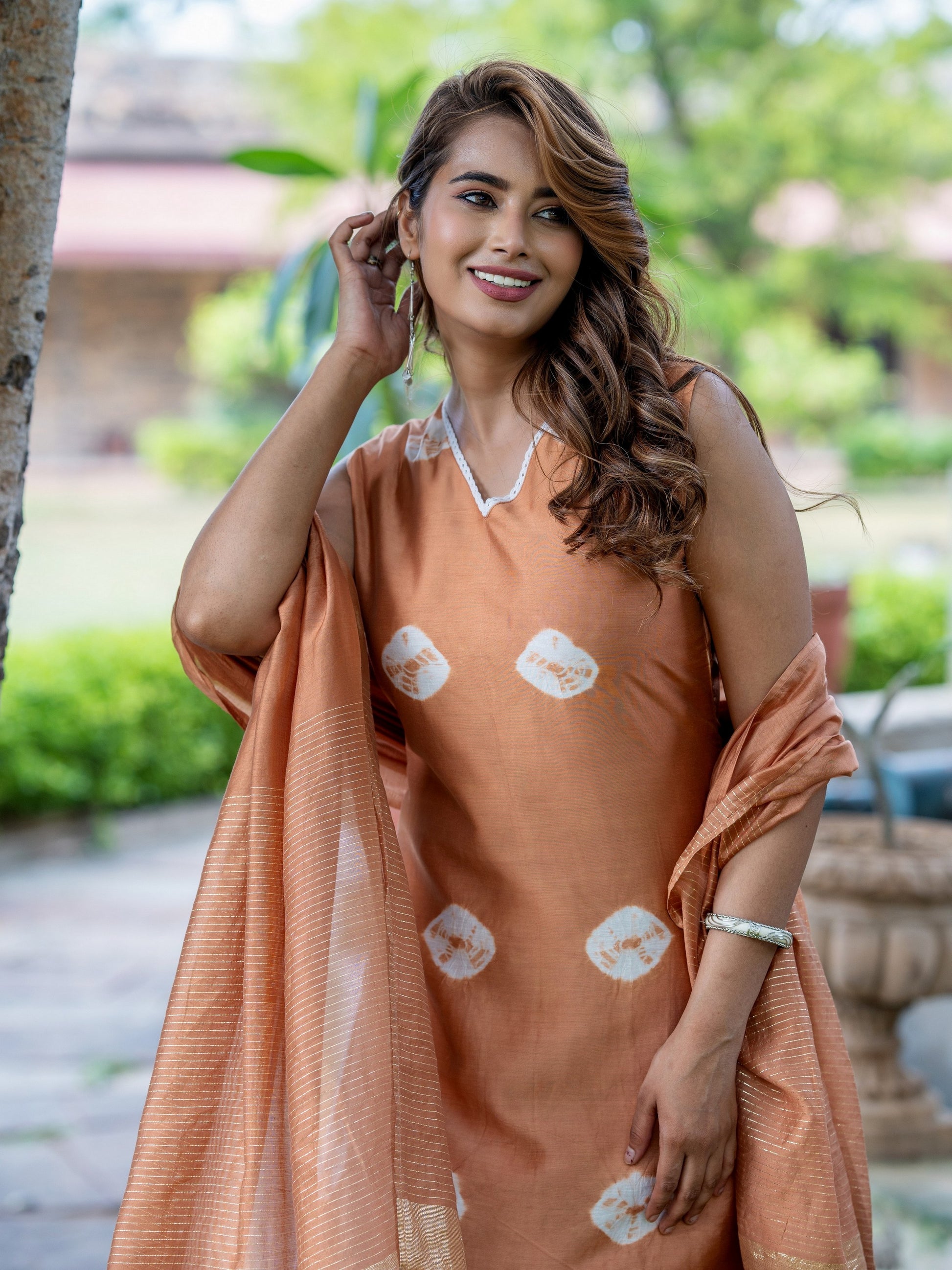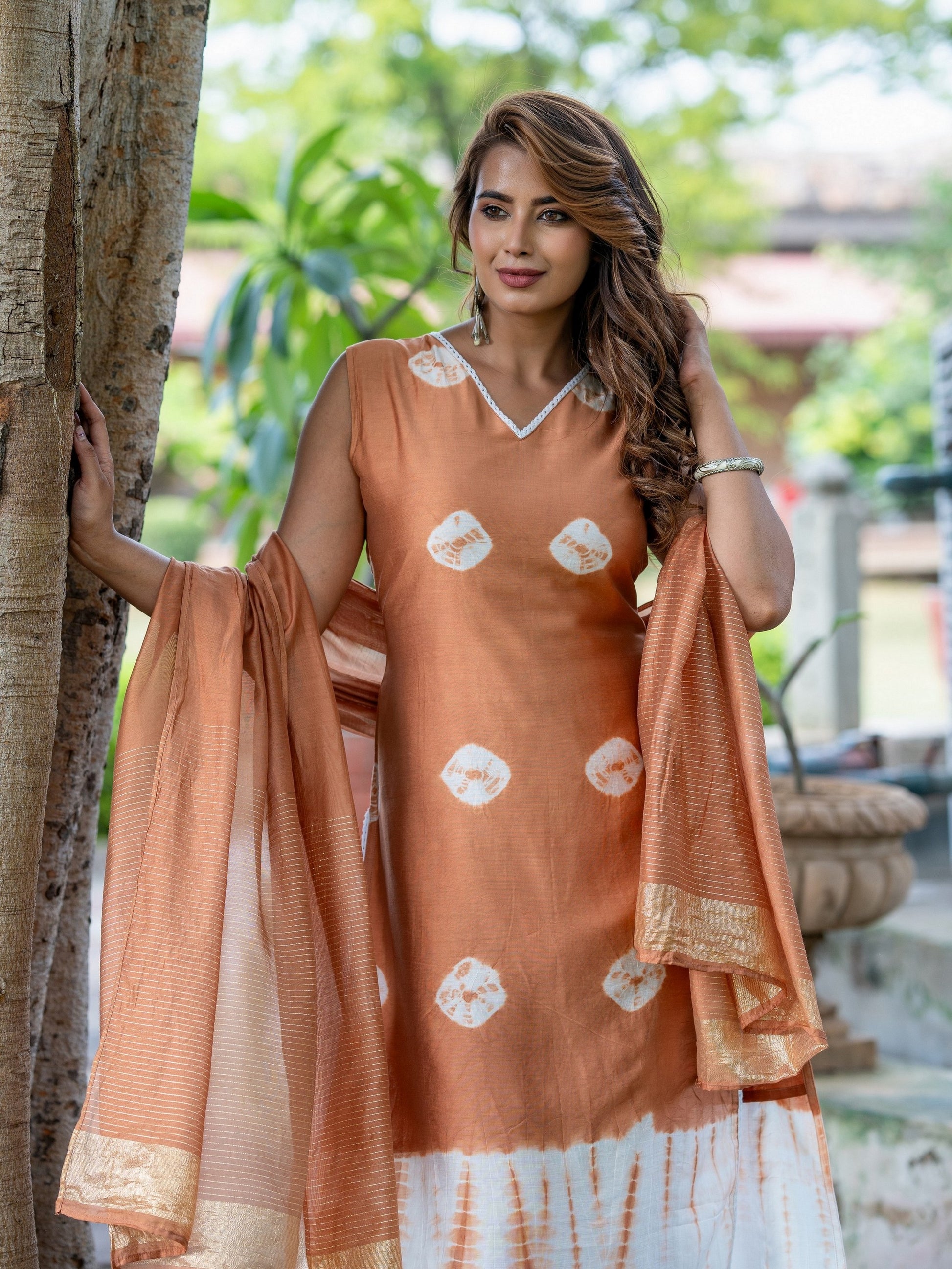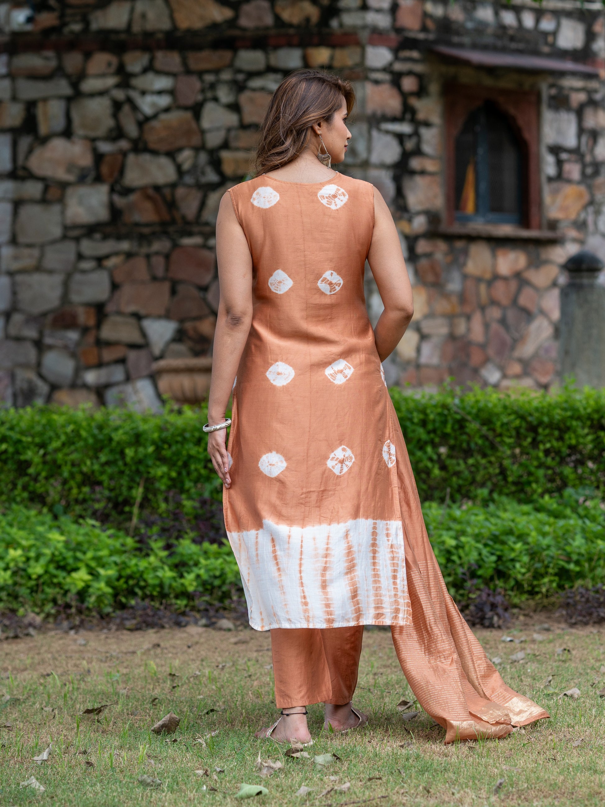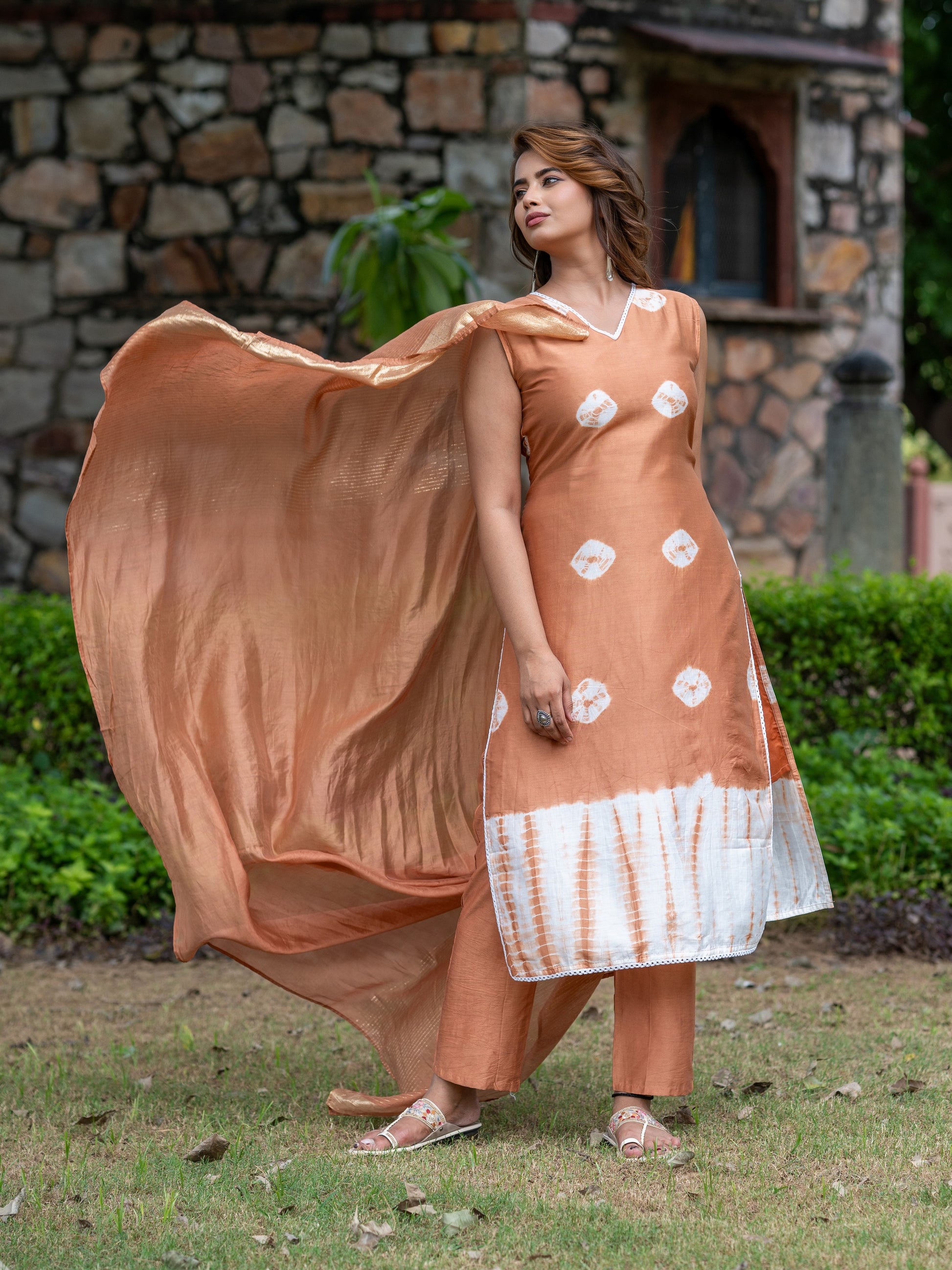 Aspora Brown Pure Silk Shibori Printed Straight Kurta With Trousers & Dupatta