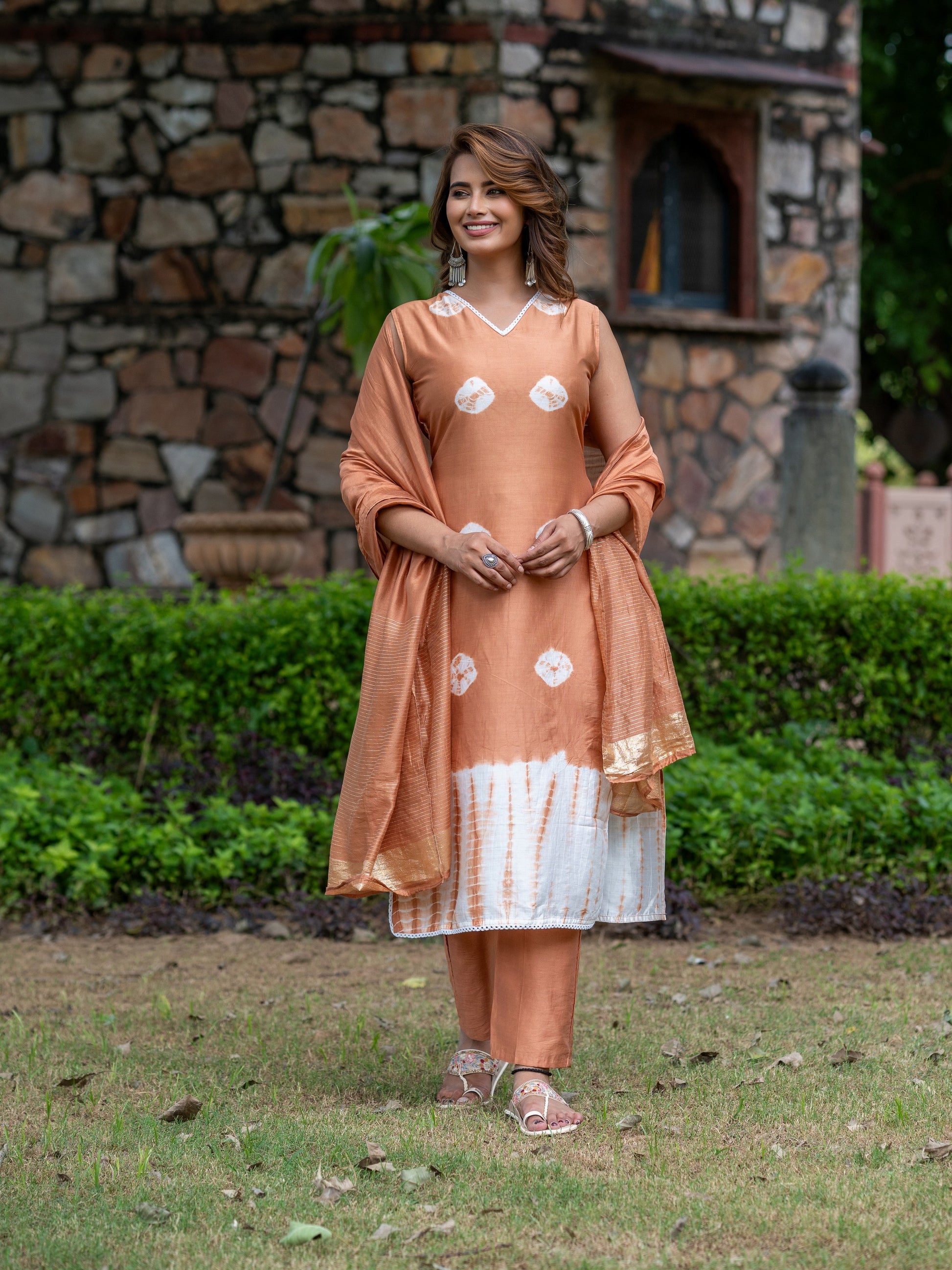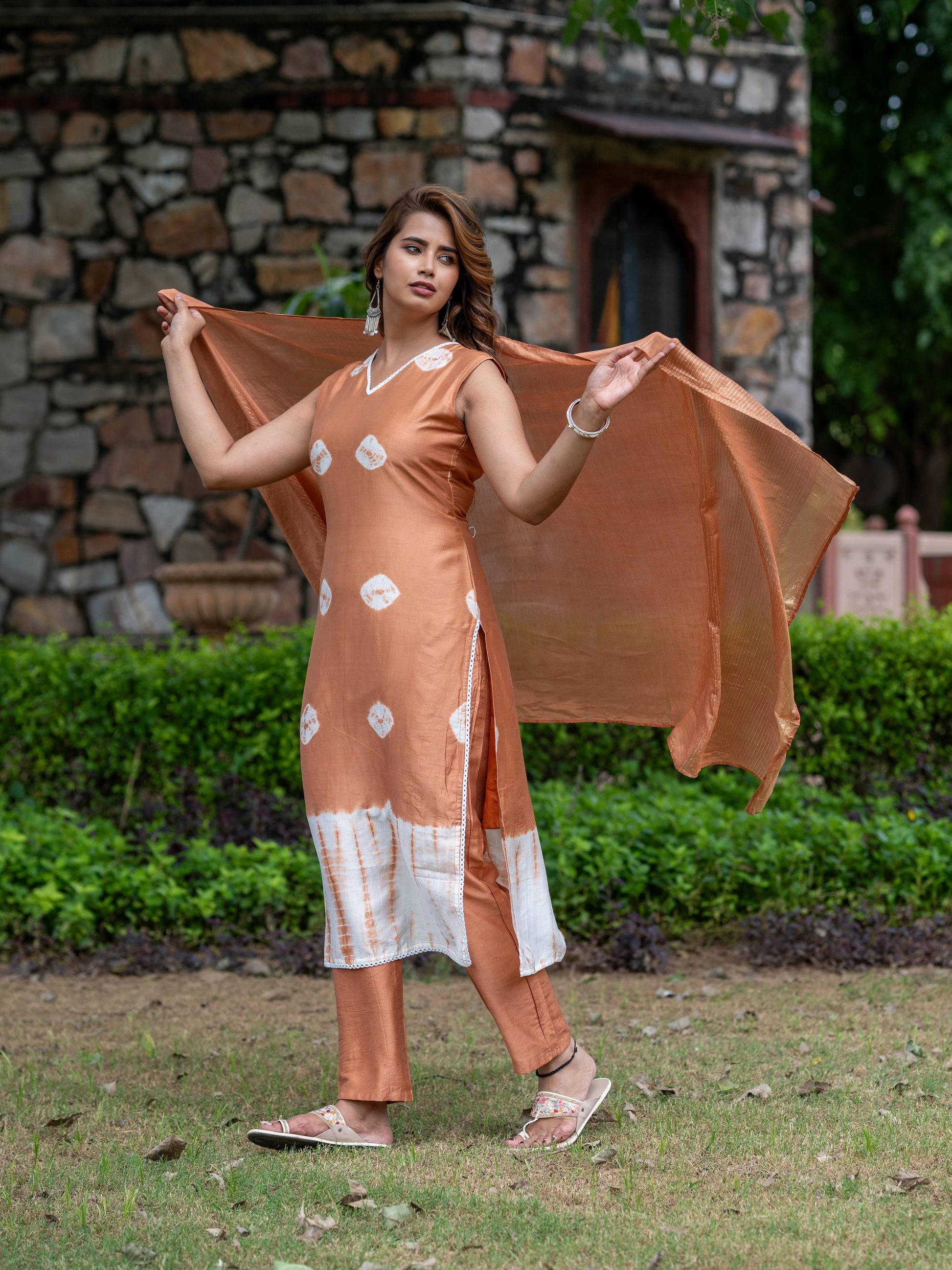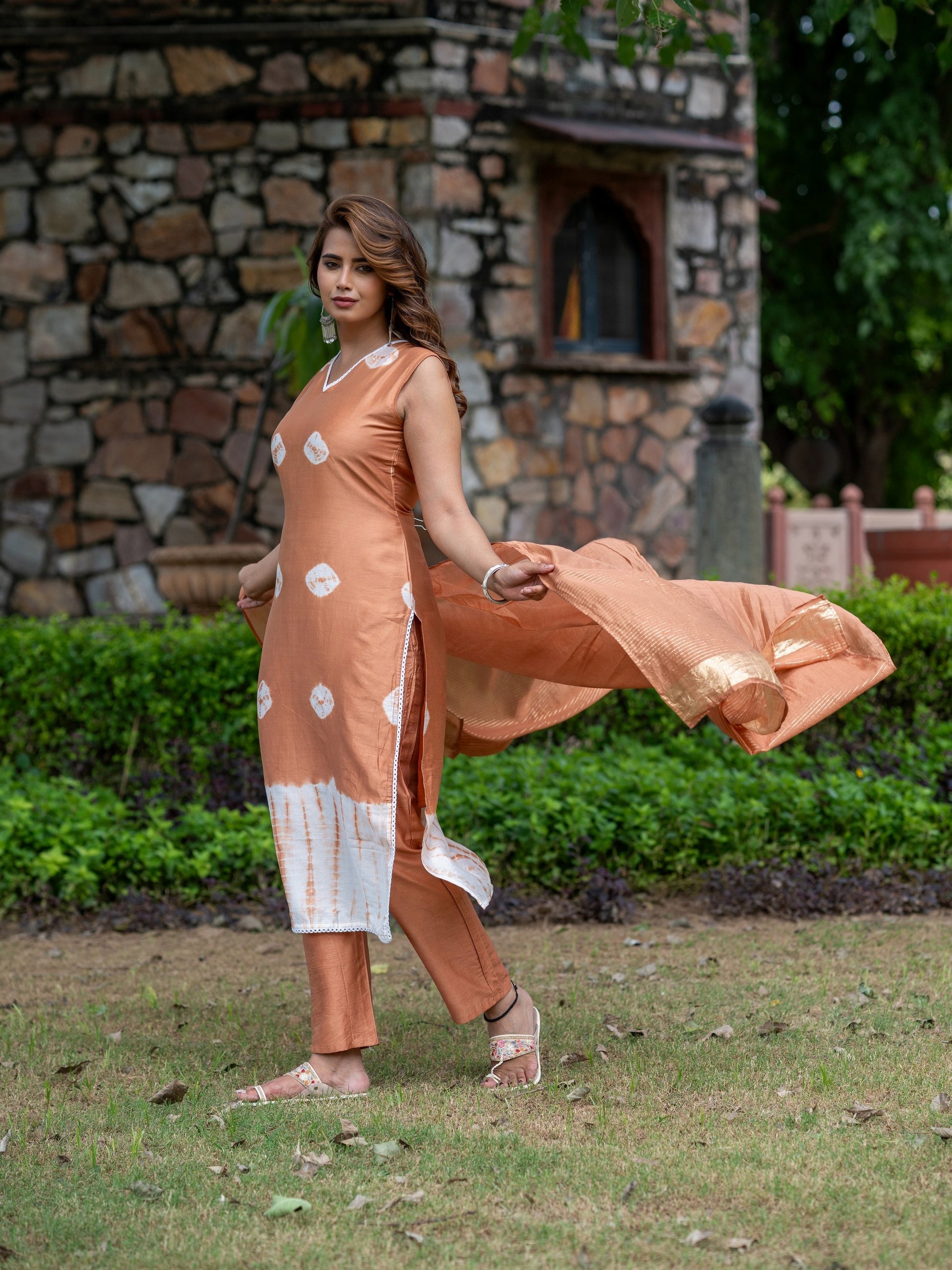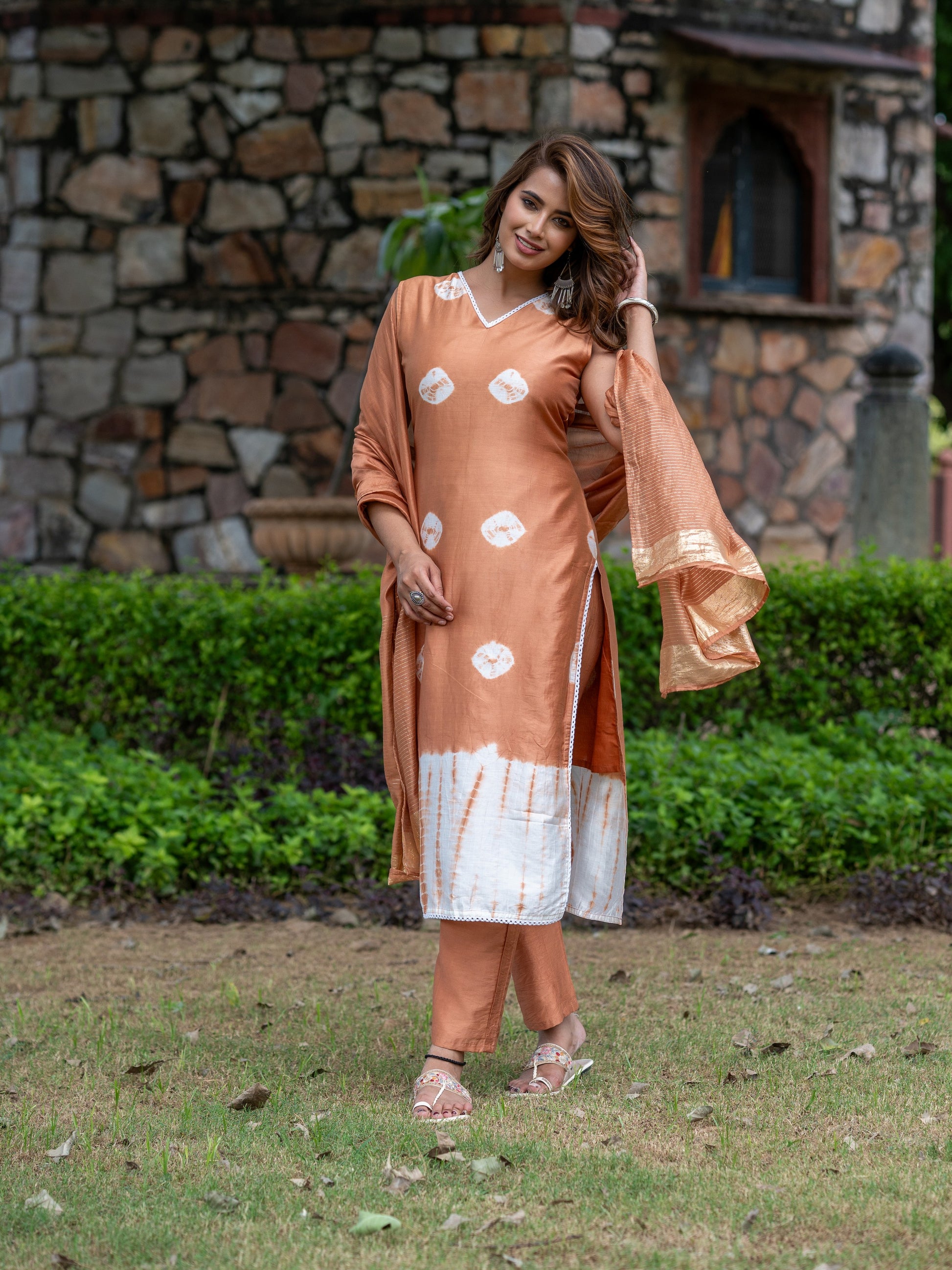 Aspora Brown Pure Silk Shibori Printed Straight Kurta With Trousers & Dupatta