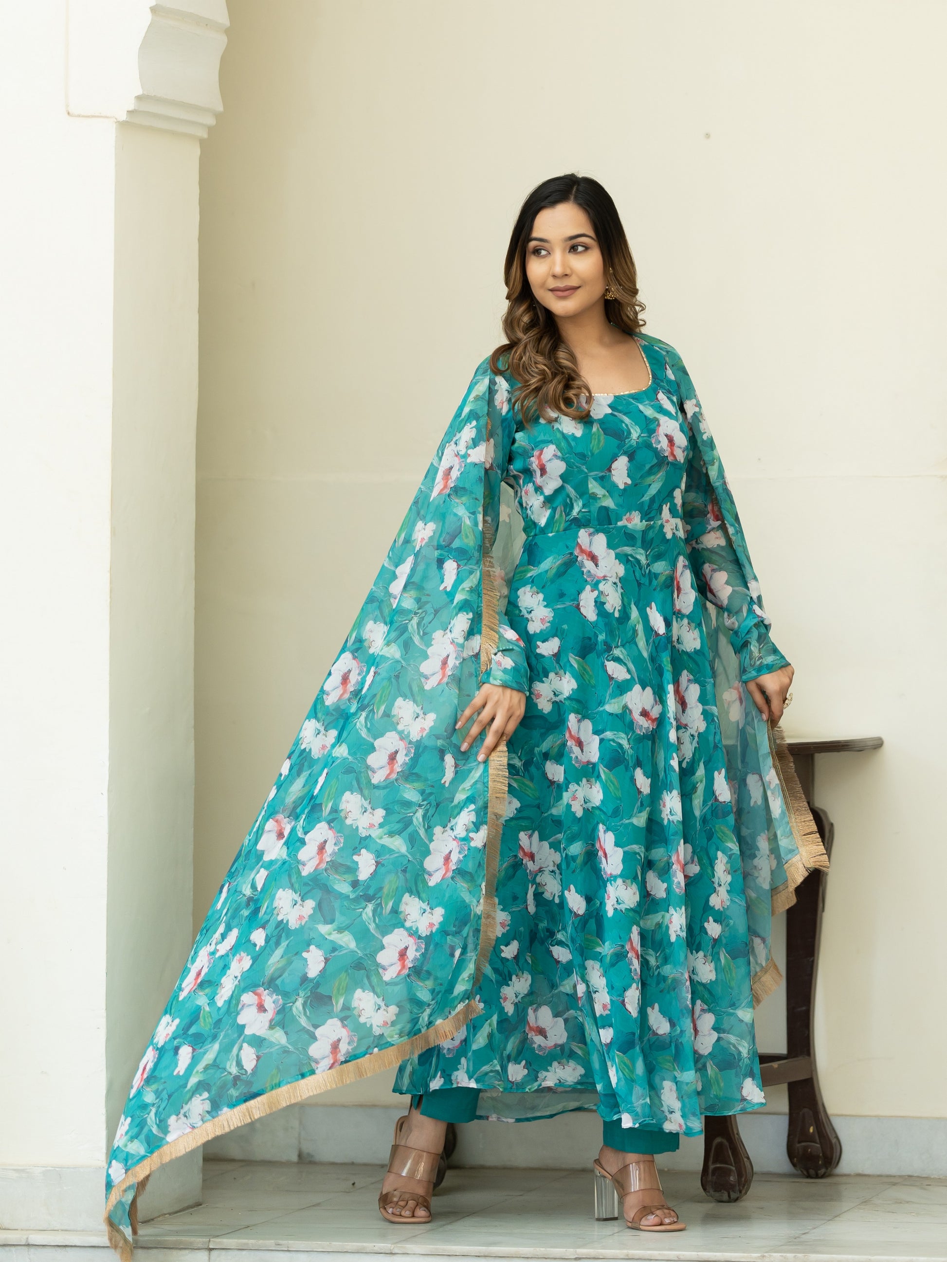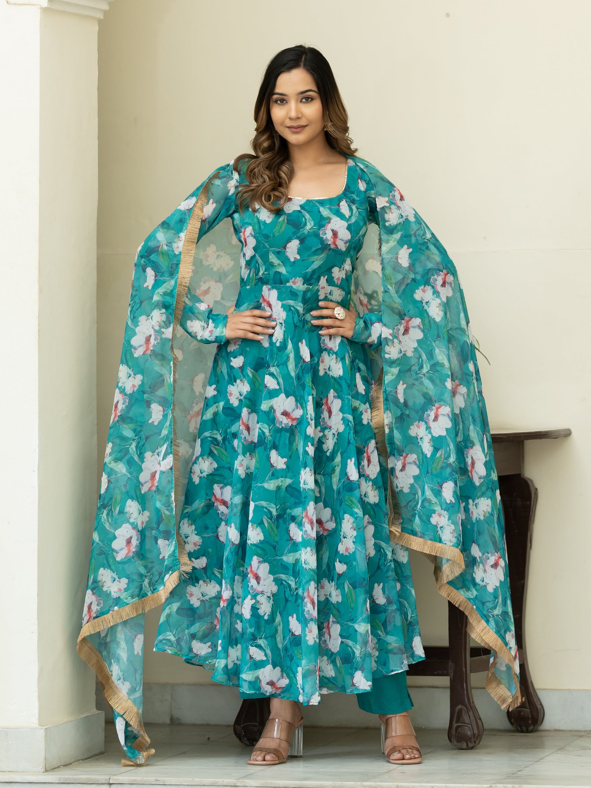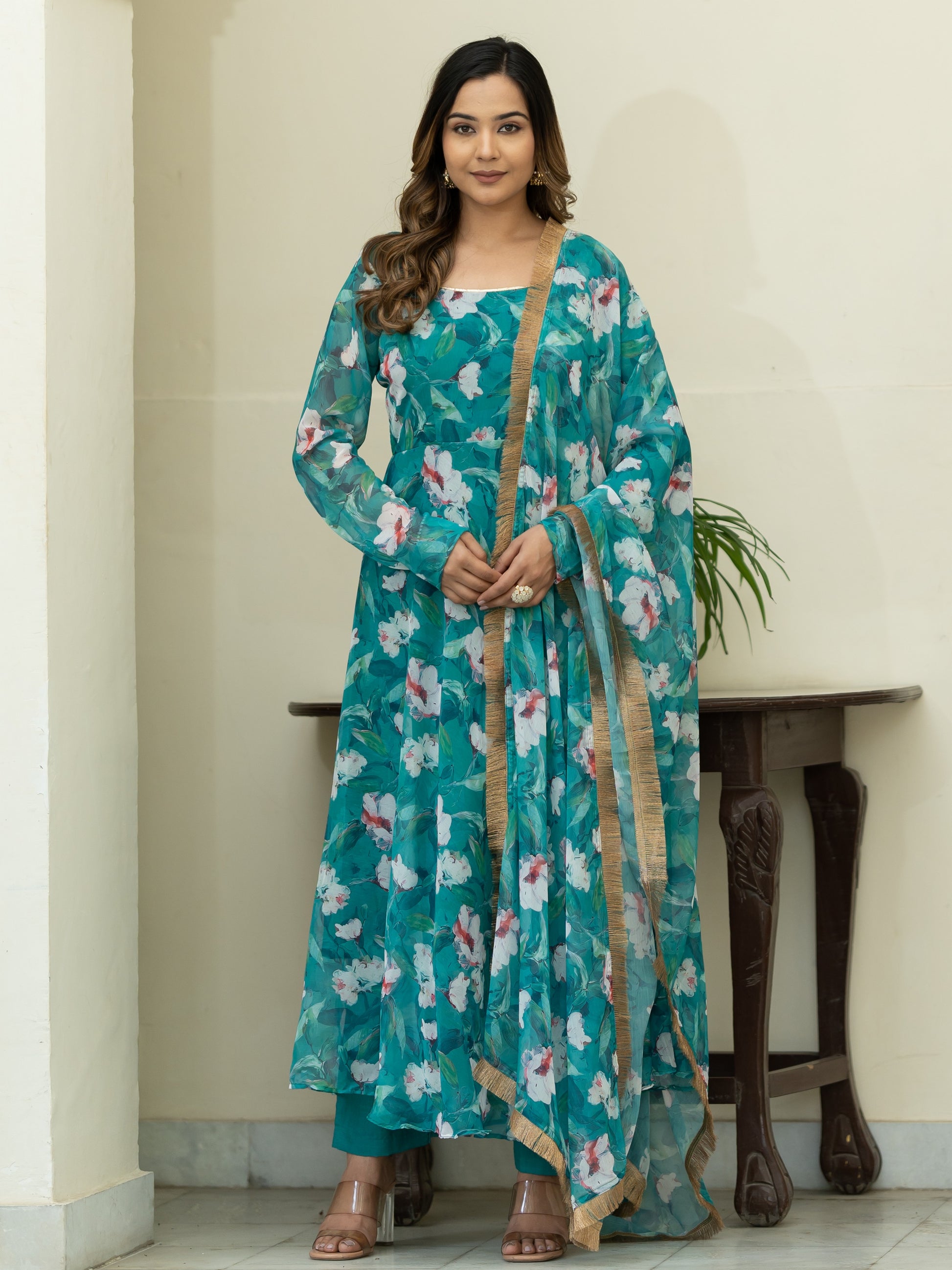 Aspora Green Floral Printed Anarkali Kurta With Trousers & Dupatta