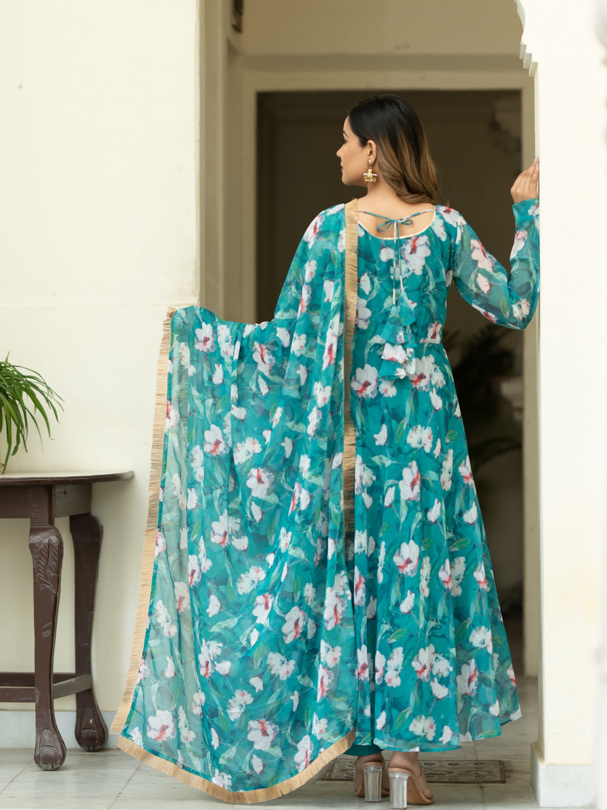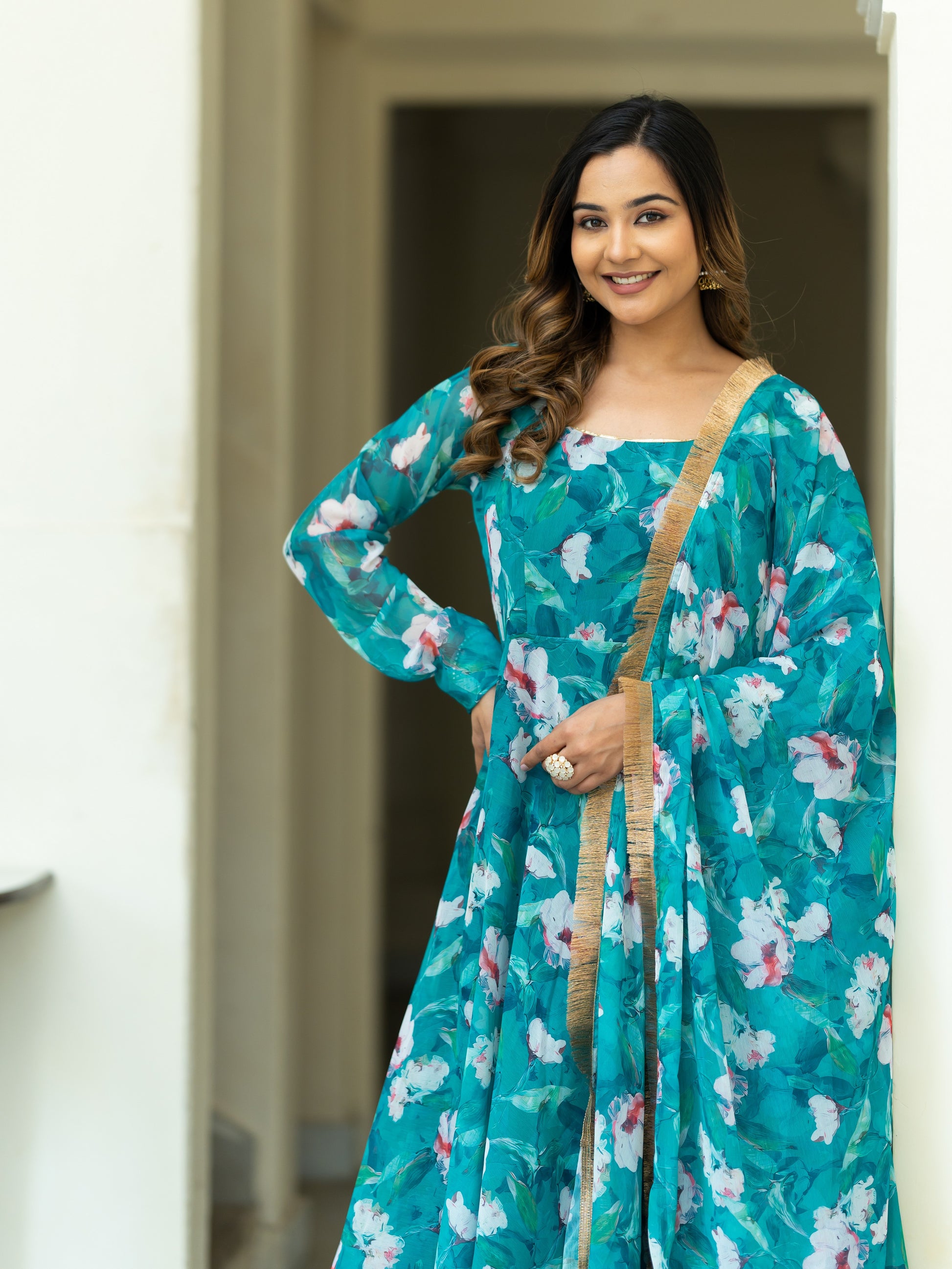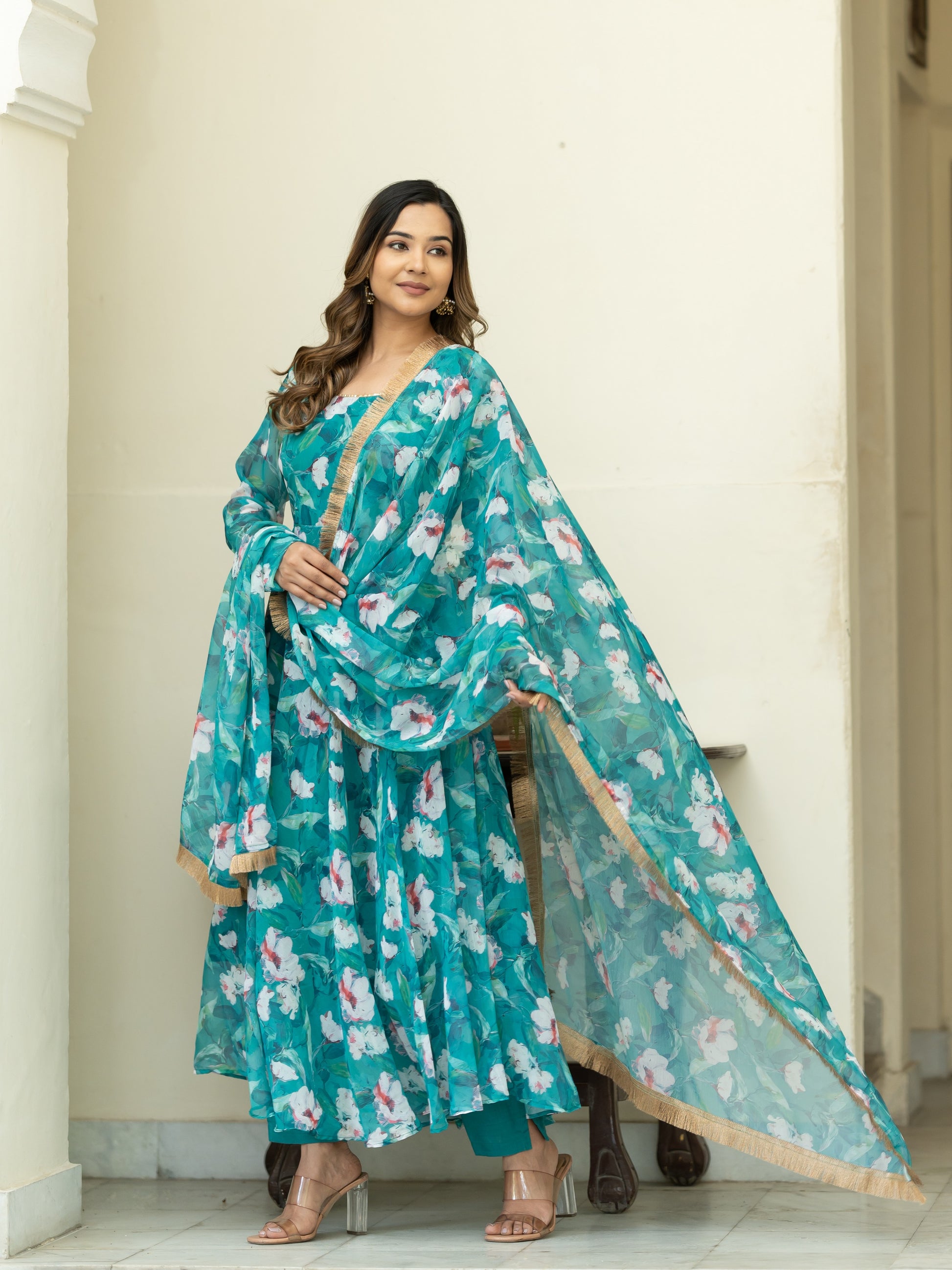 Aspora Green Floral Printed Anarkali Kurta With Trousers & Dupatta