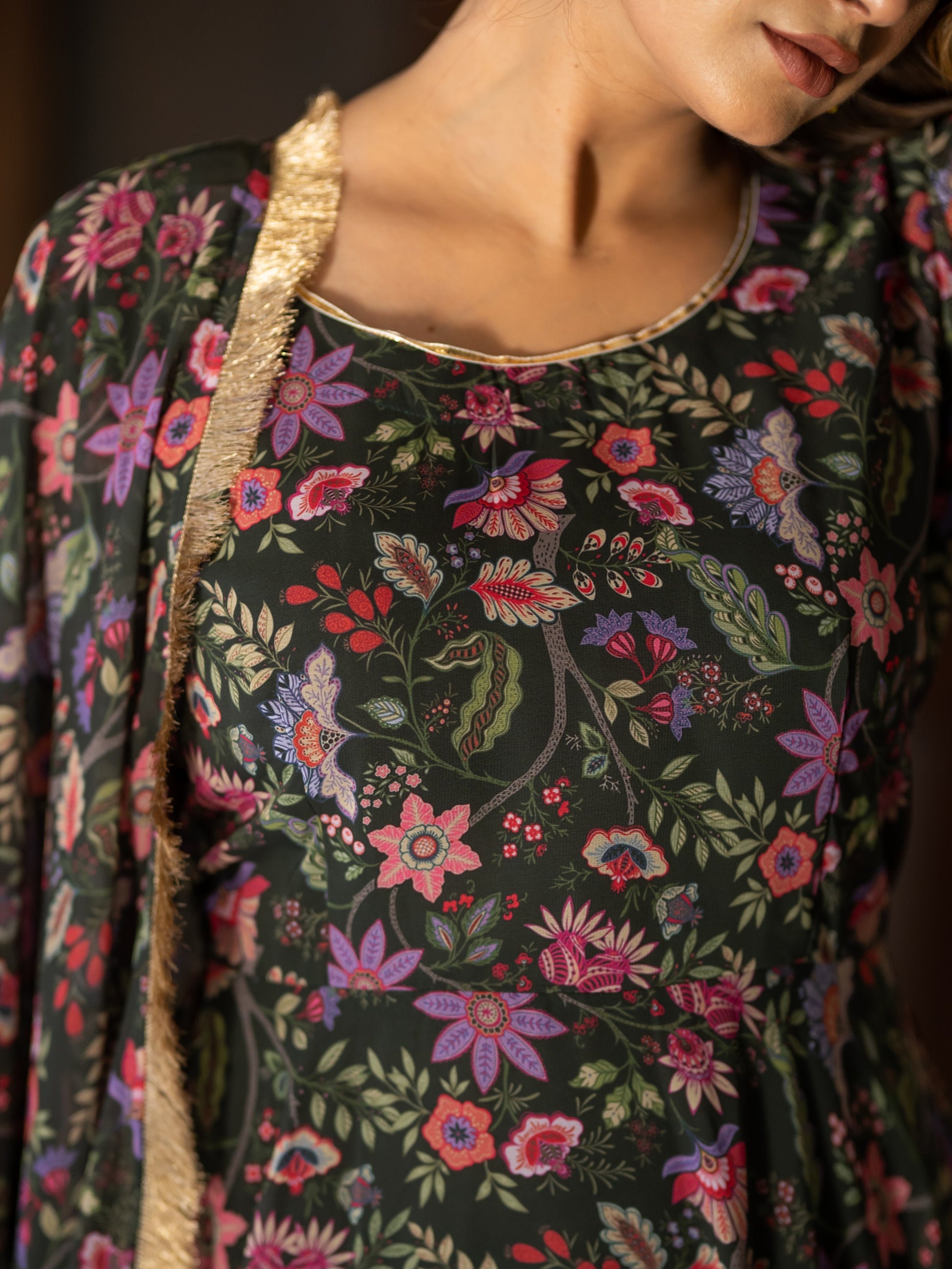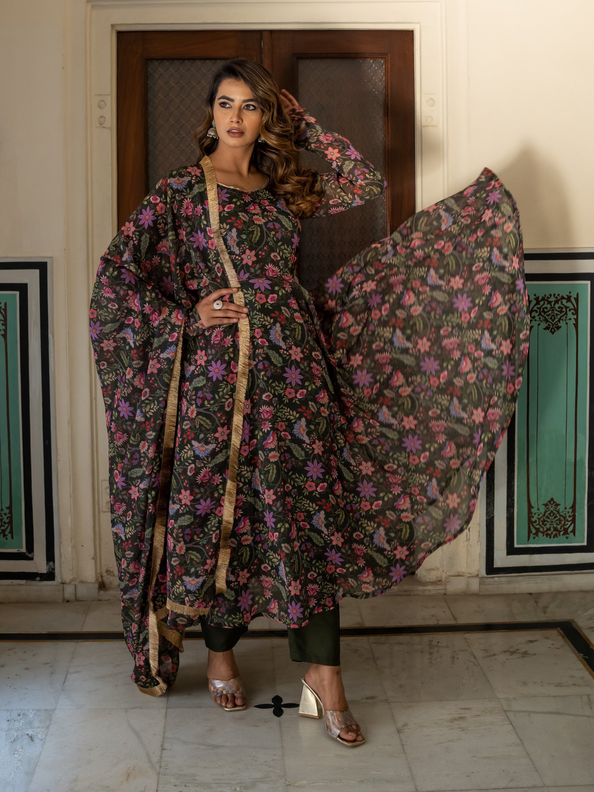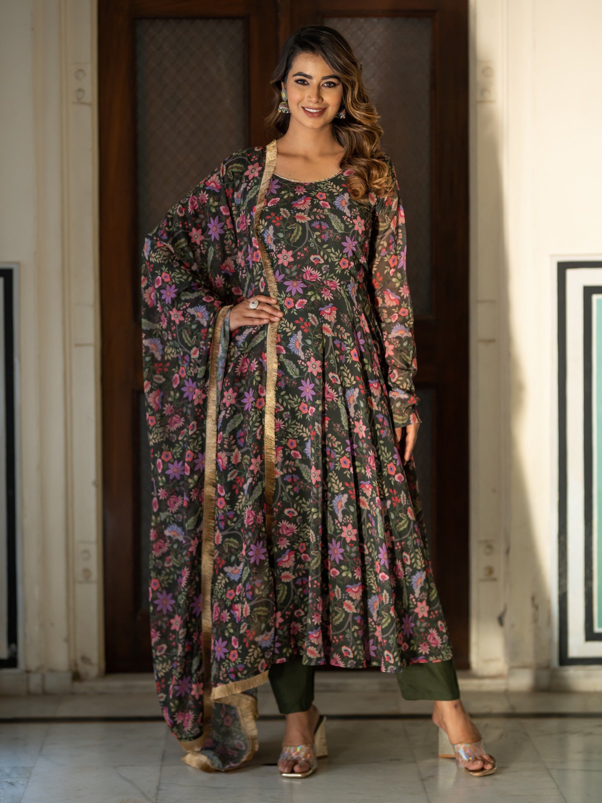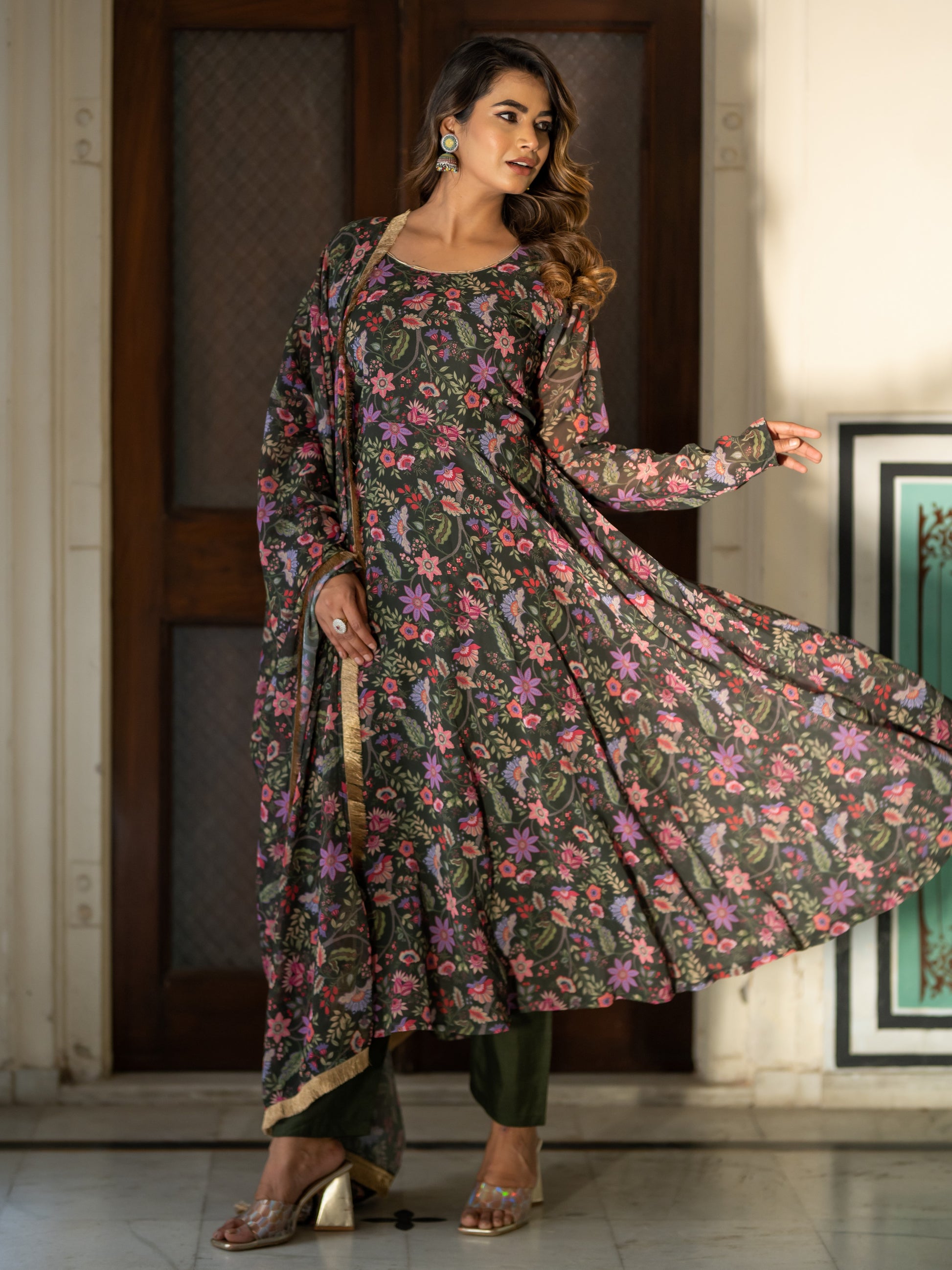 Aspora Olive Floral printed Anarkali Kurta With Trousers & Dupatta