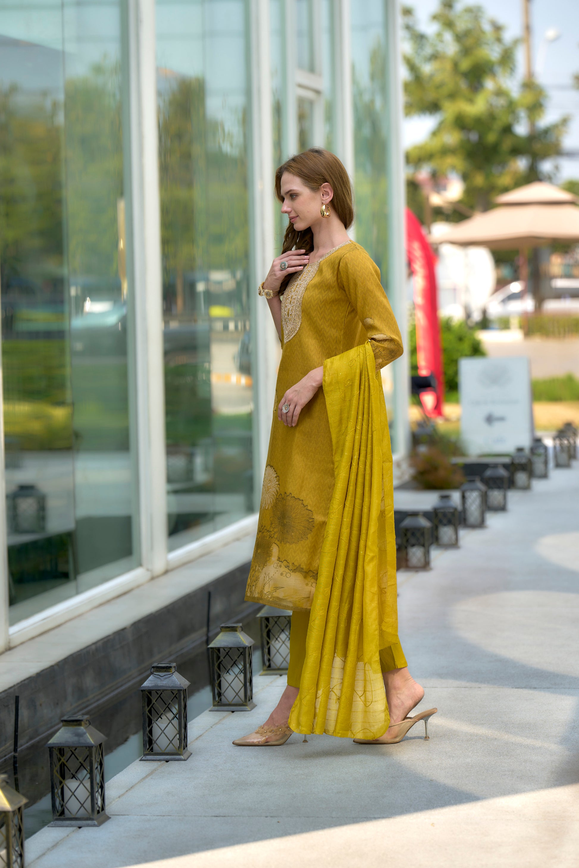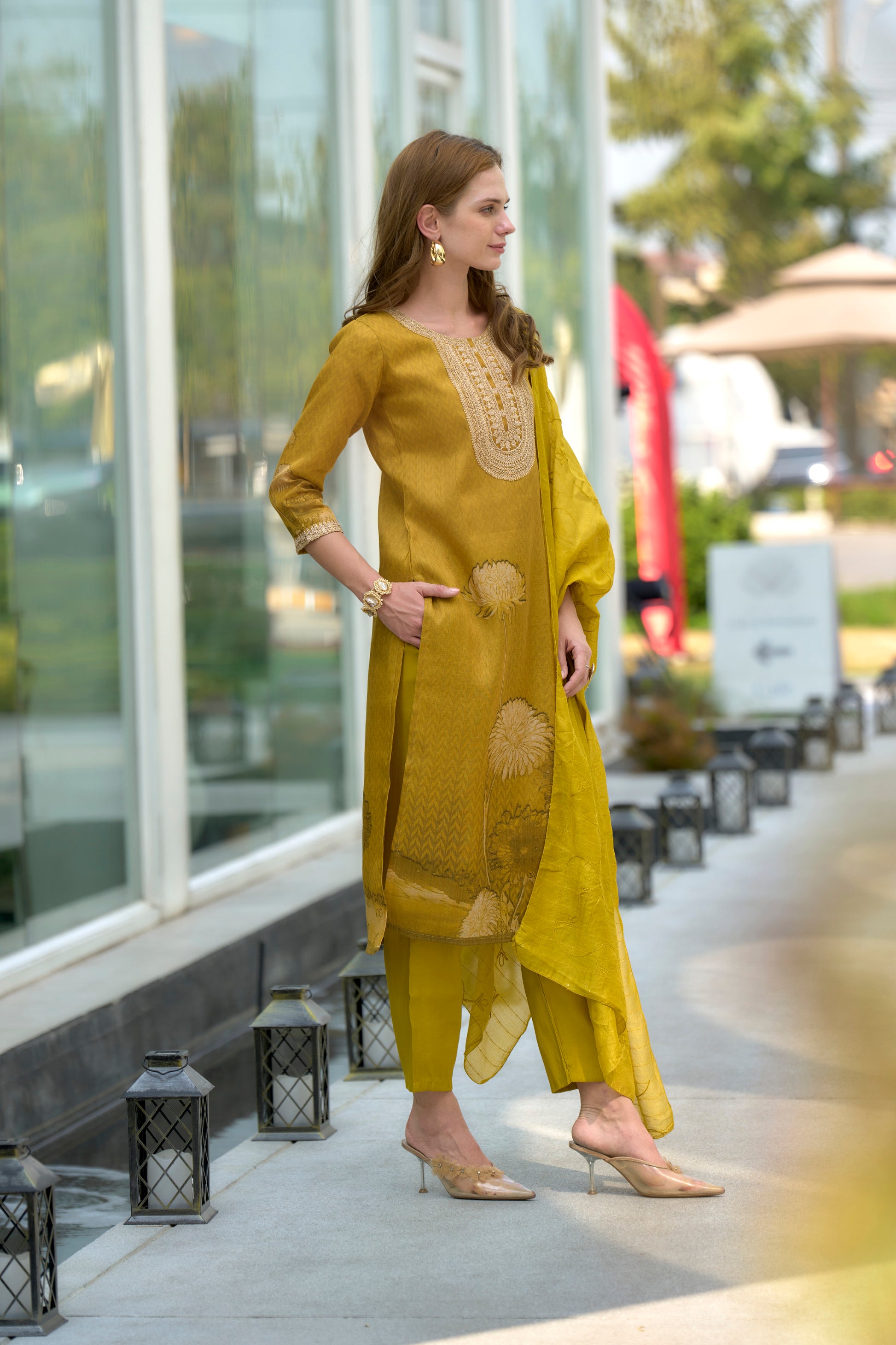 Mustard Yellow Tissue Kurta Set with Floral Print and Embroidered Dupatta