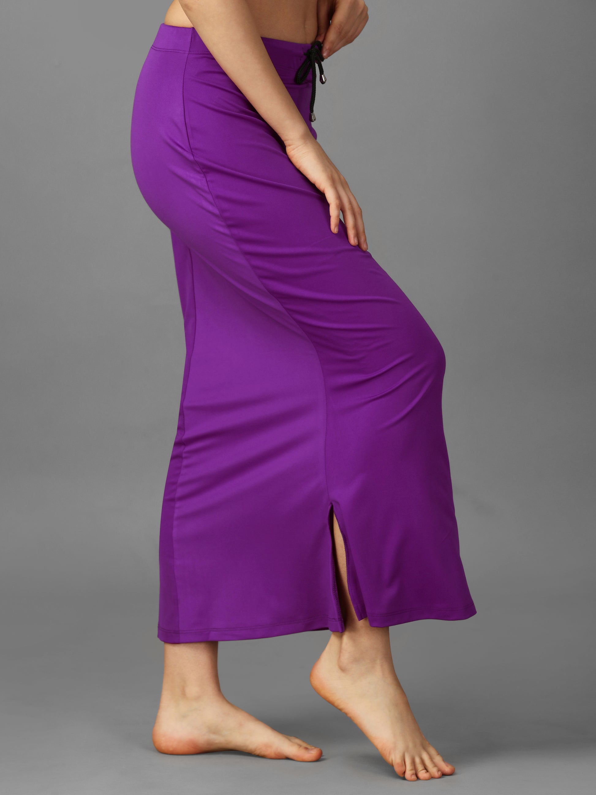 Purple knitted shapewear with an elasticated waistband and drawstring closure, designed for comfort and a sleek fit.