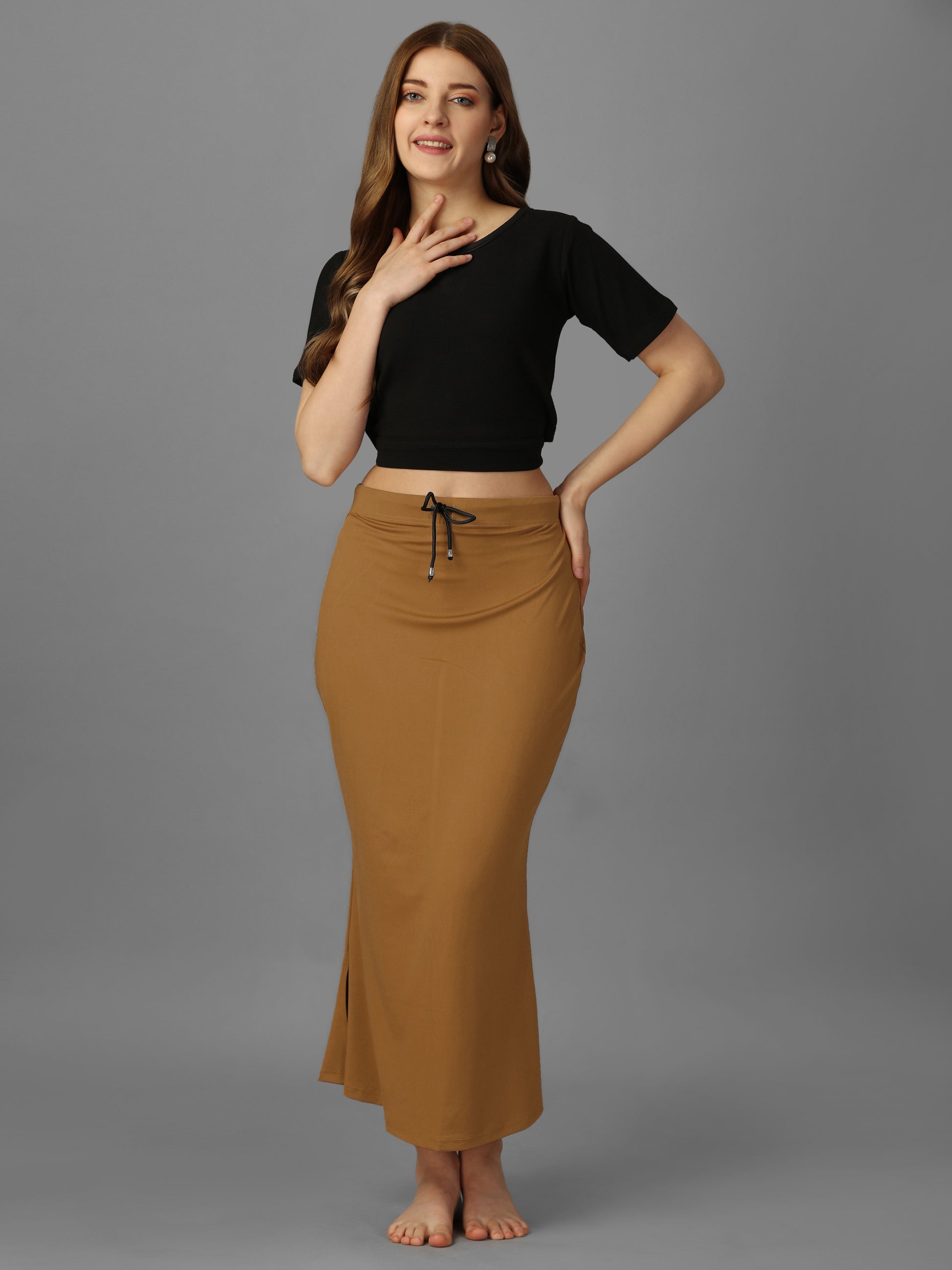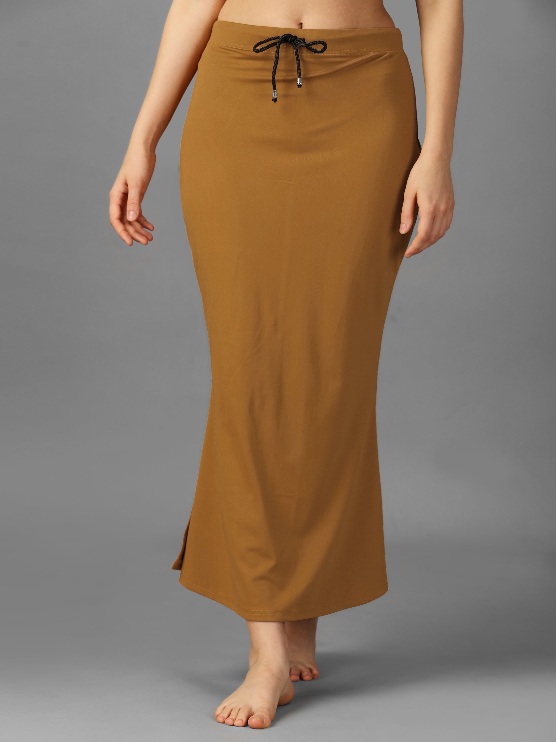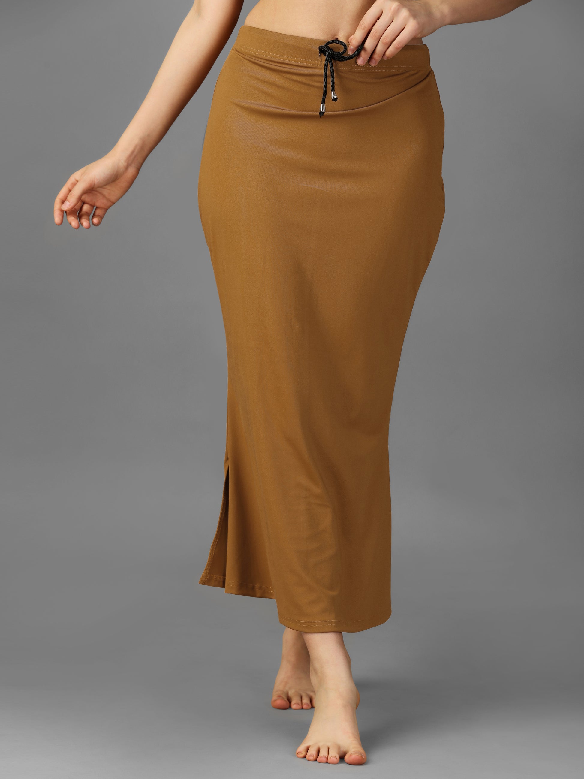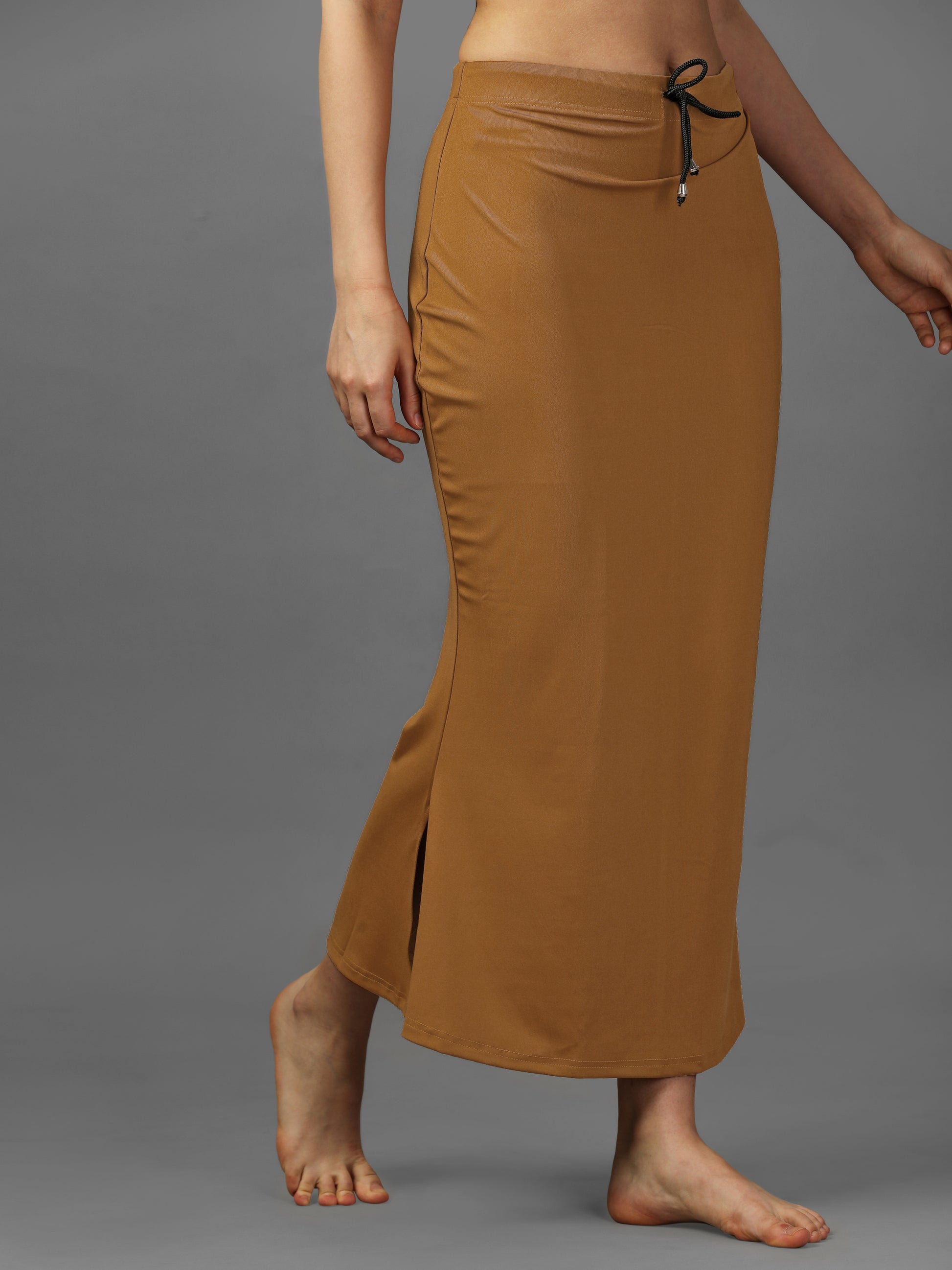 Brown Beige knitted shapewear with an elasticated waistband and drawstring closure, designed for comfort and a sleek fit.