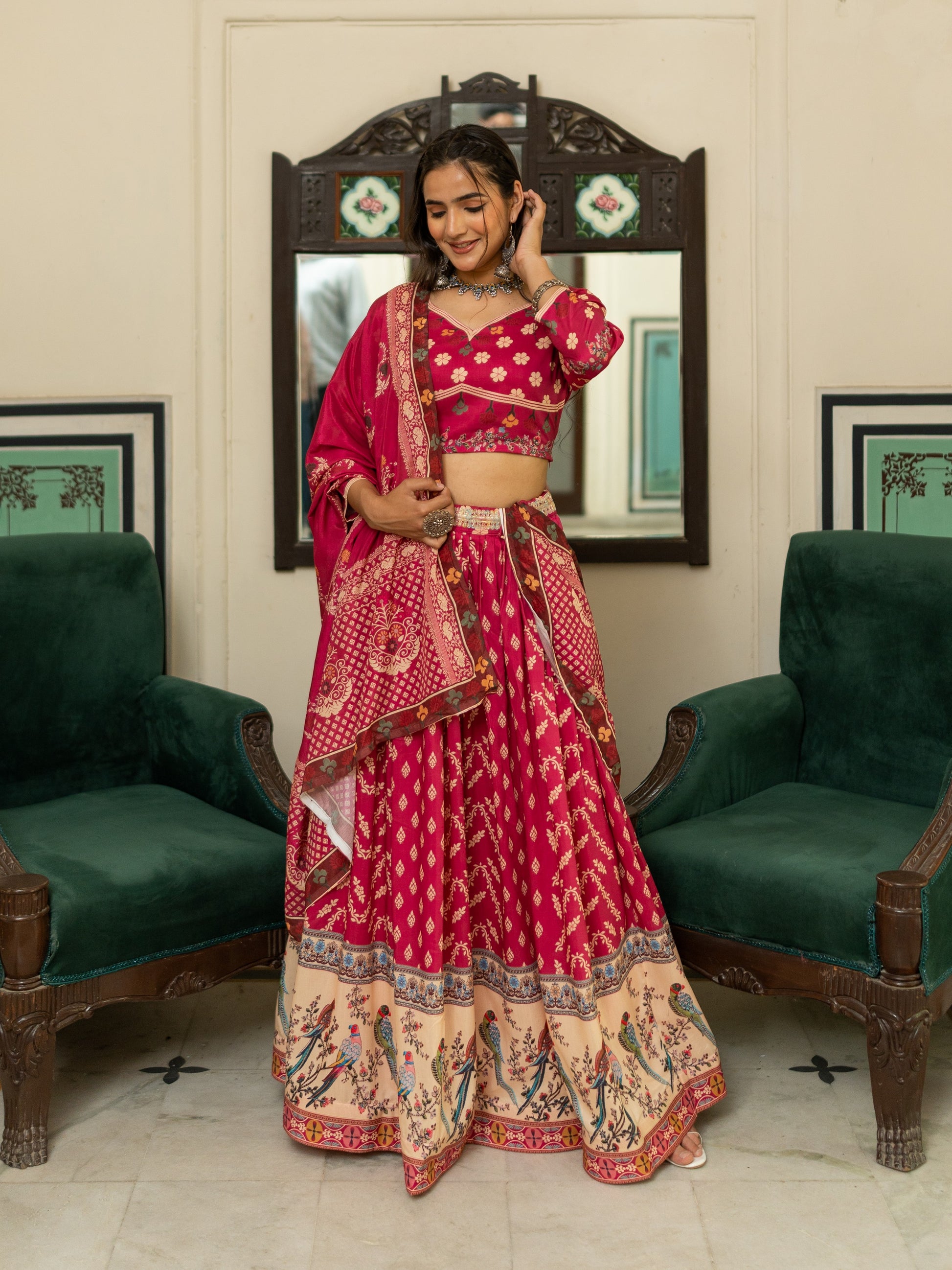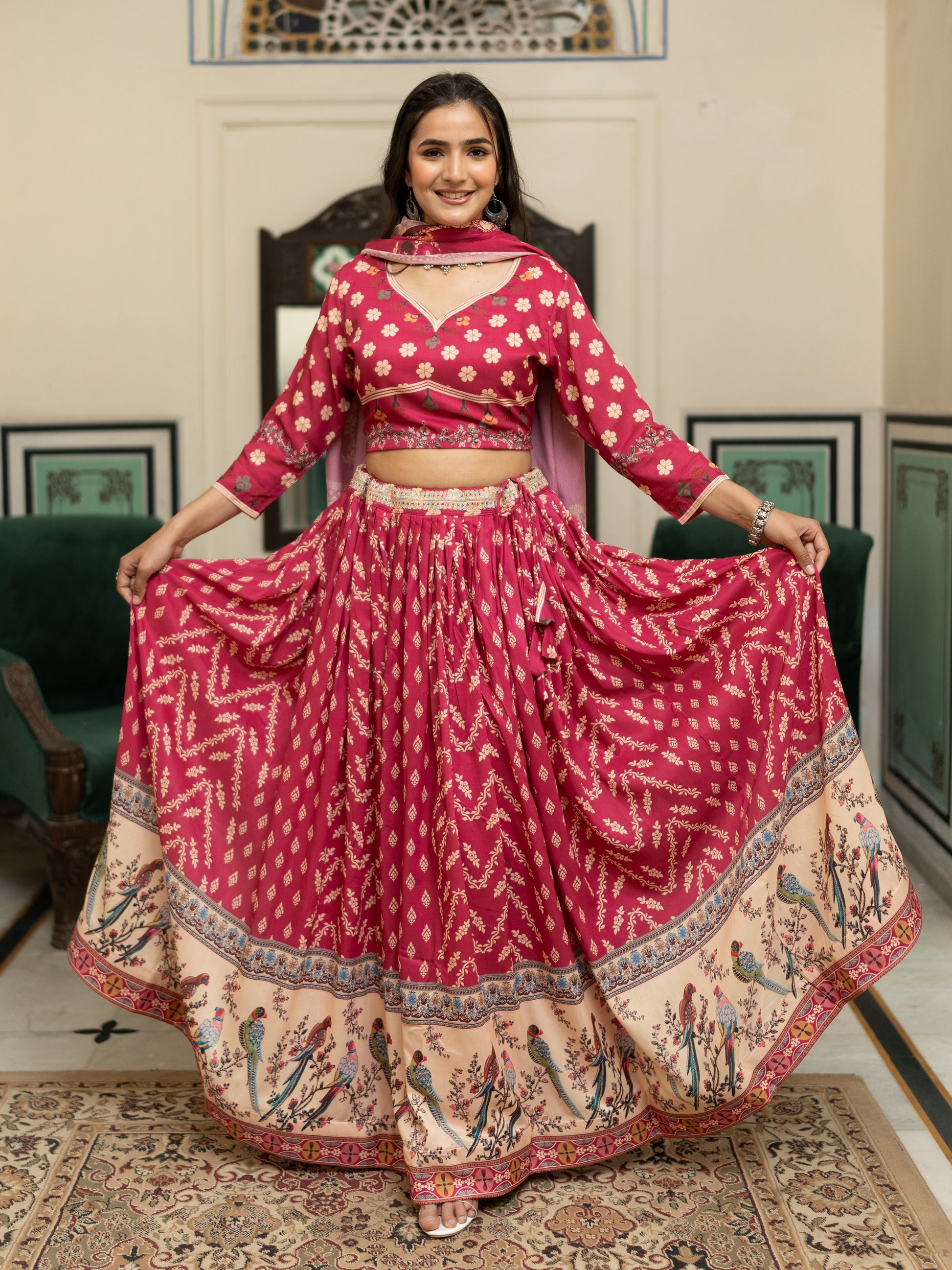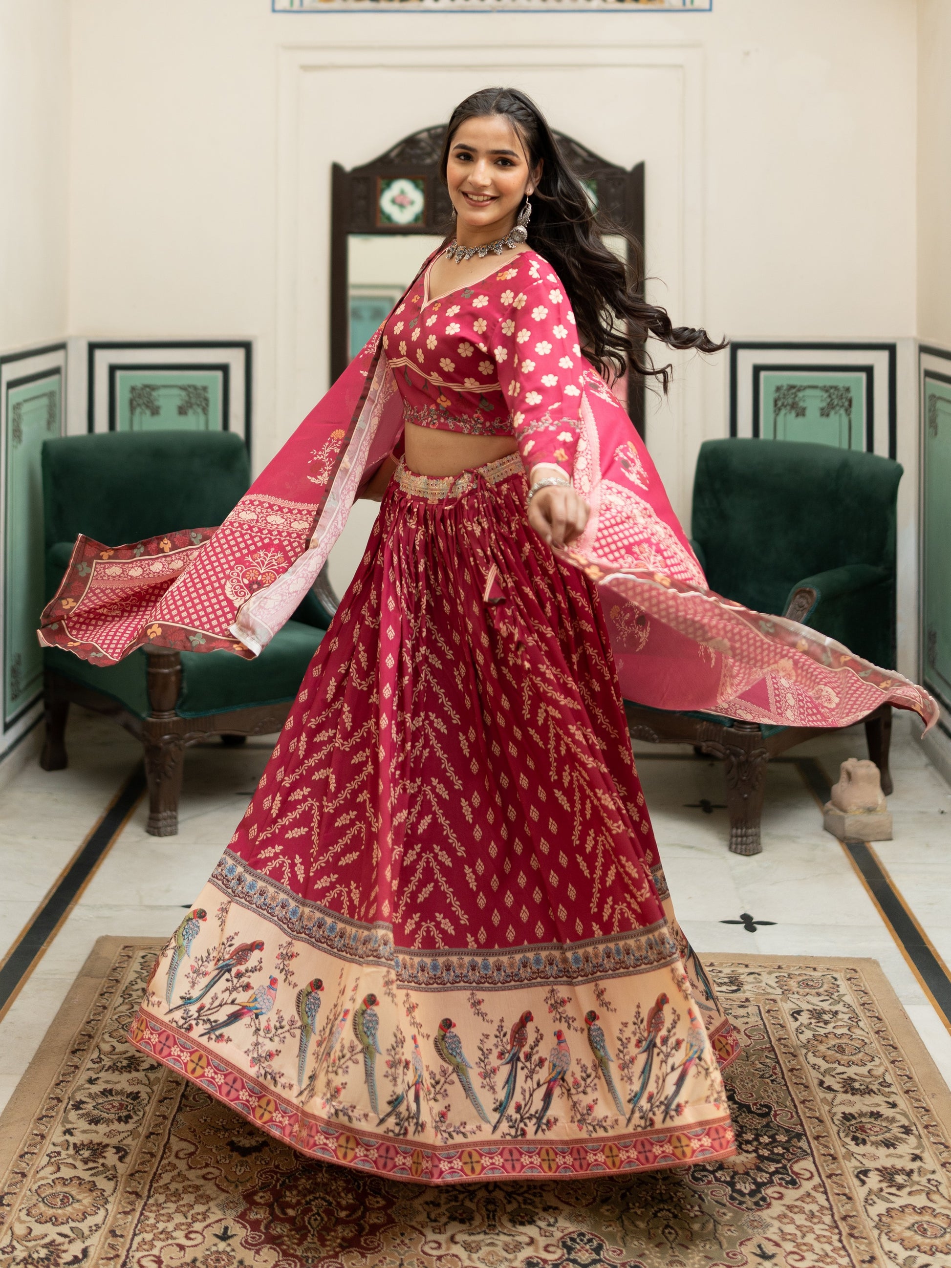 Dark Pink Printed Semi-Stitched Lehenga & Unstitched Blouse With Dupatta (LHG-BL-ASL_17-Burgundy)