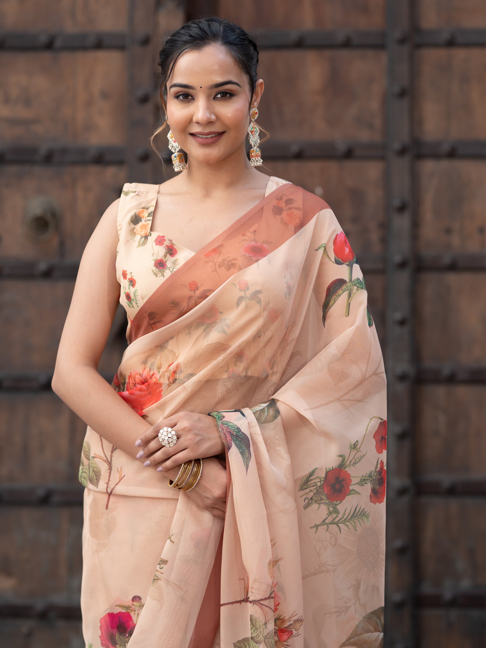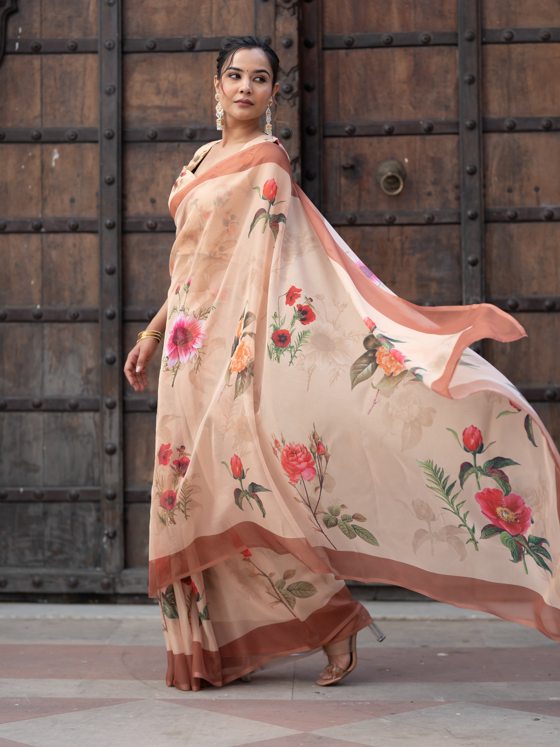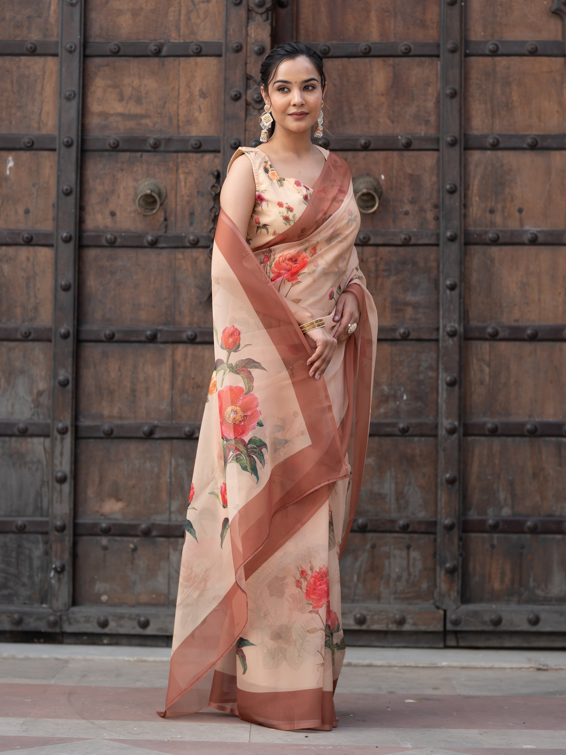 Aspora Women's Beige Poly Georgette Floral Printed Saree With Blouse Piece (SR-BL-O14-Beige)