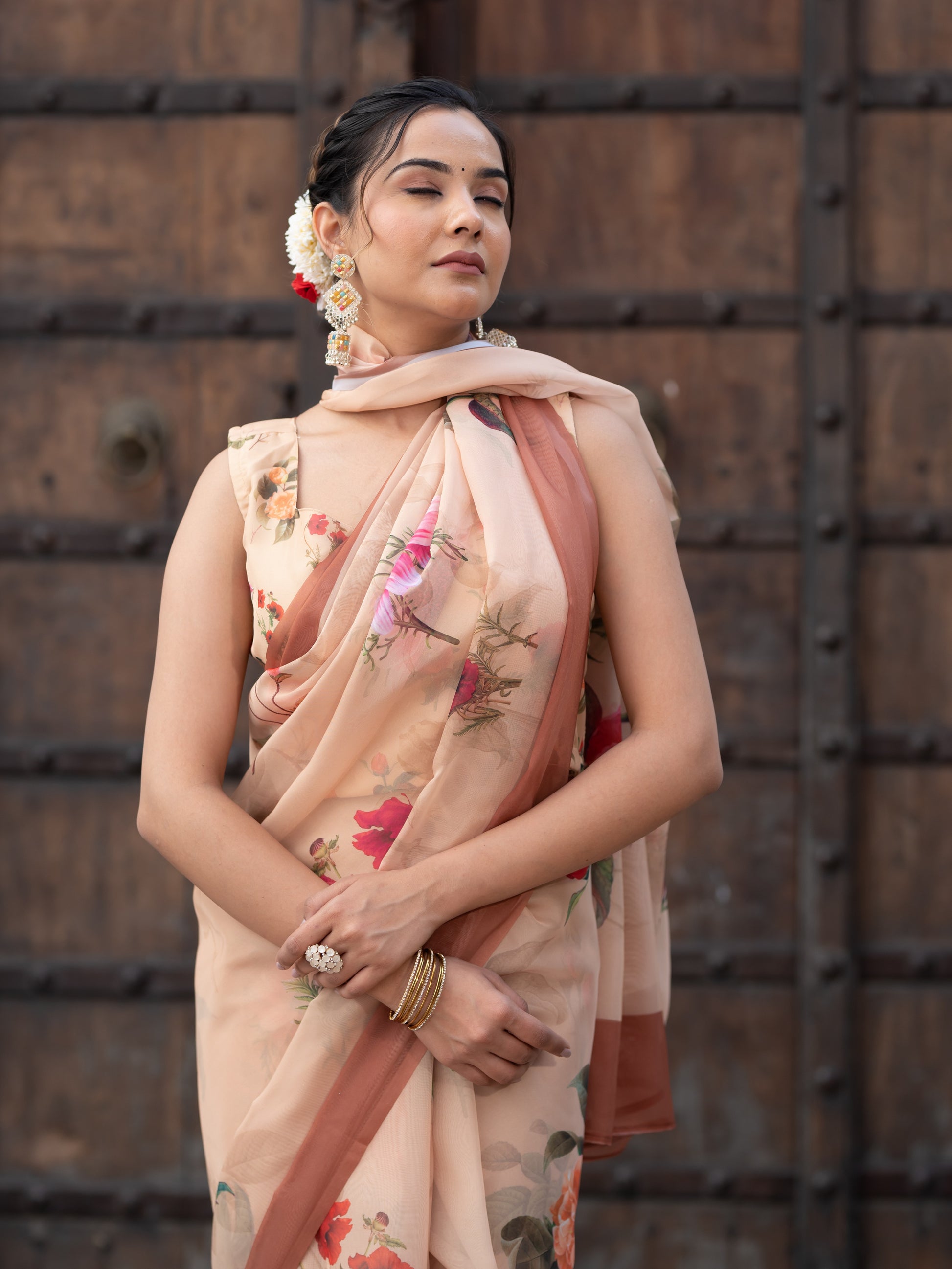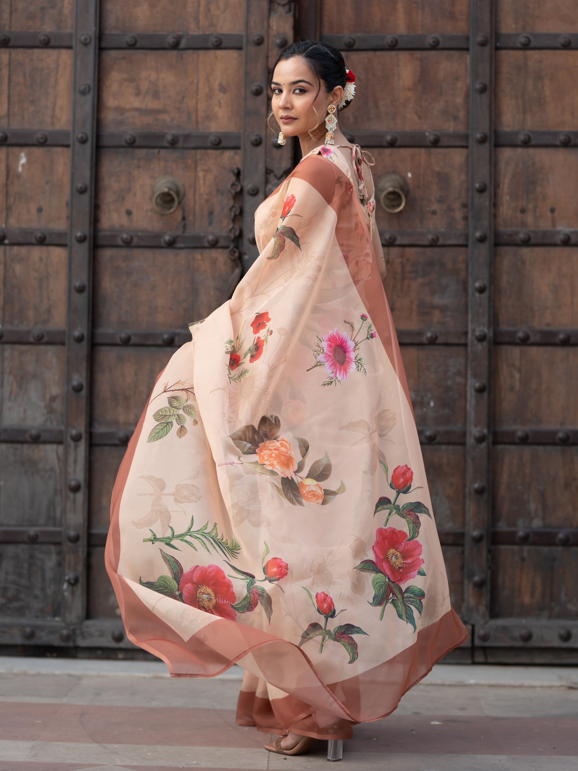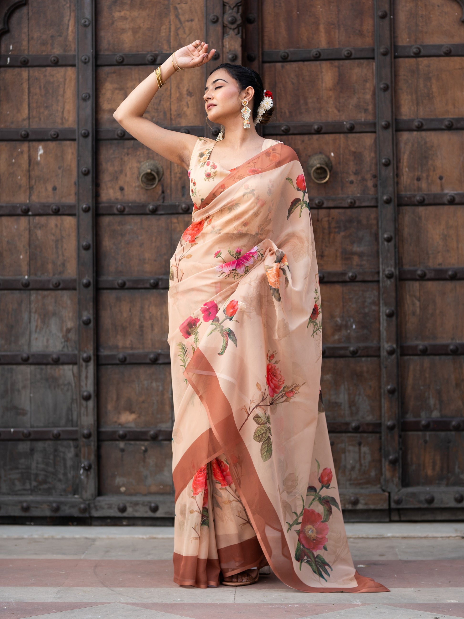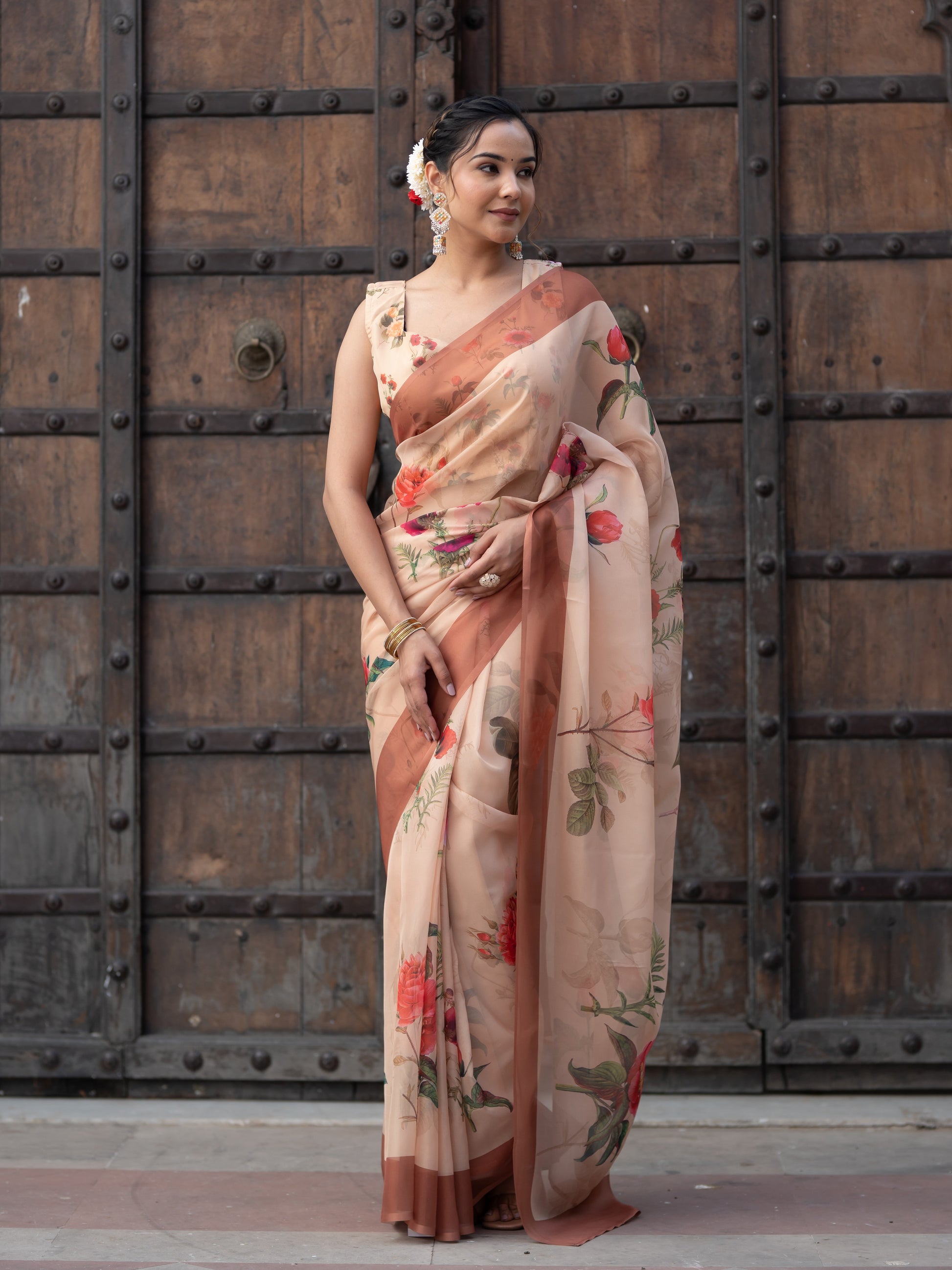 Aspora Women's Beige Poly Georgette Floral Printed Saree With Blouse Piece (SR-BL-O14-Beige)