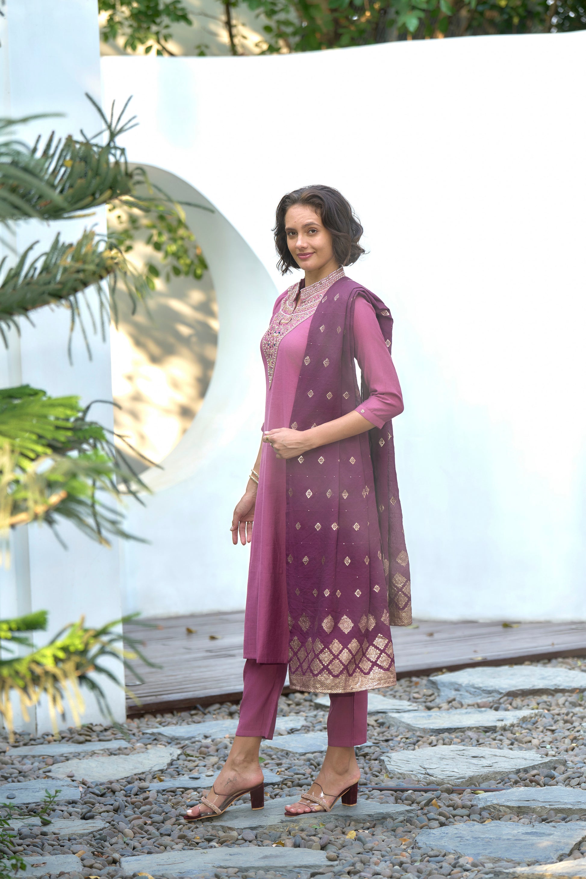 Onion Pink Embroidered Kurta Set with Vatican Trouser & Chanderi Dupatta