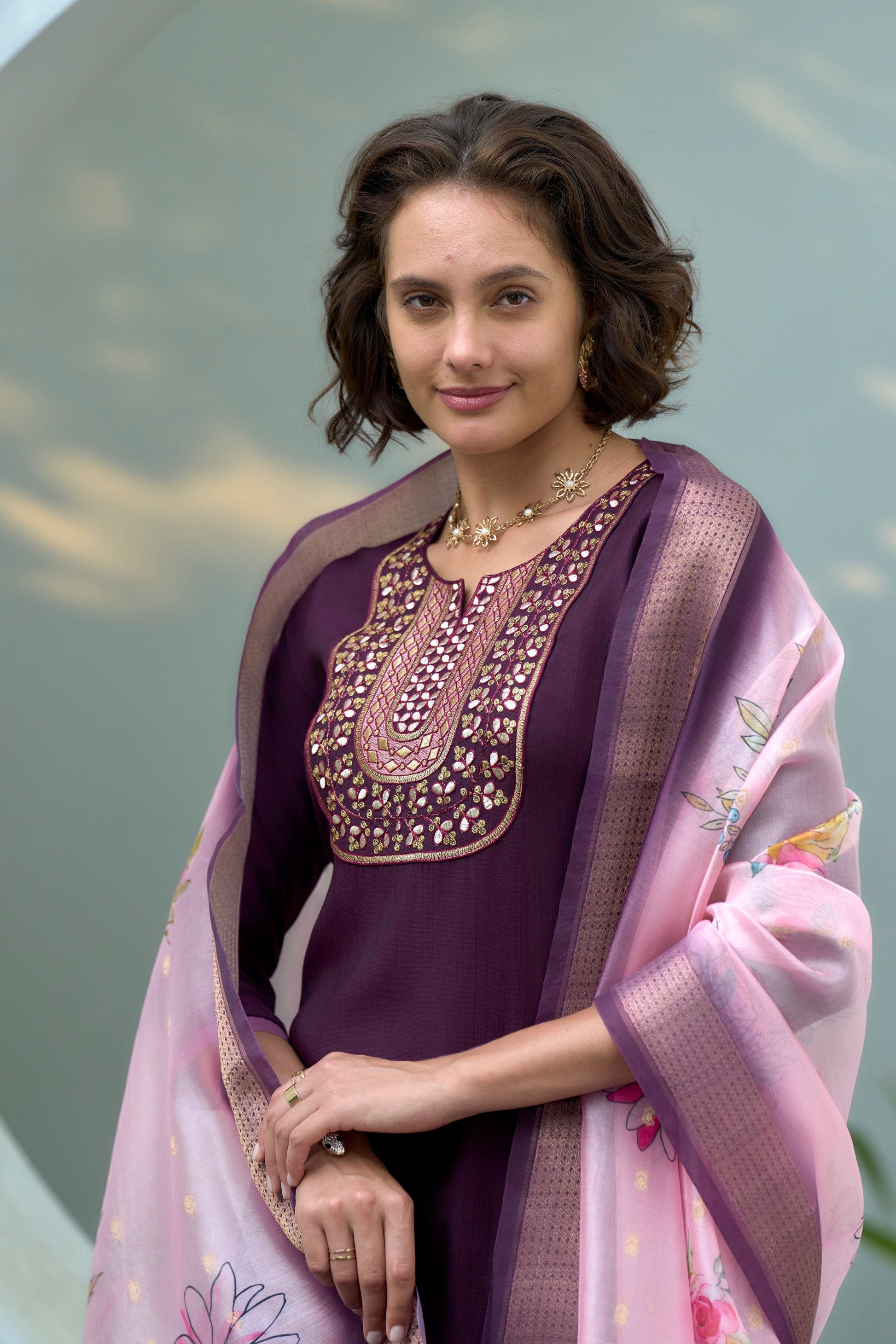 Purple Iris Embroidered Kurta with Matching Trouser & Floral Organza Dupatta